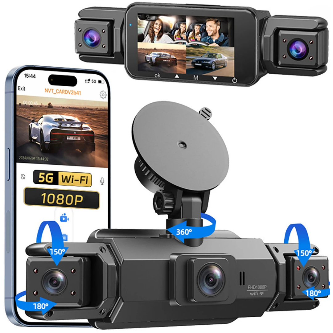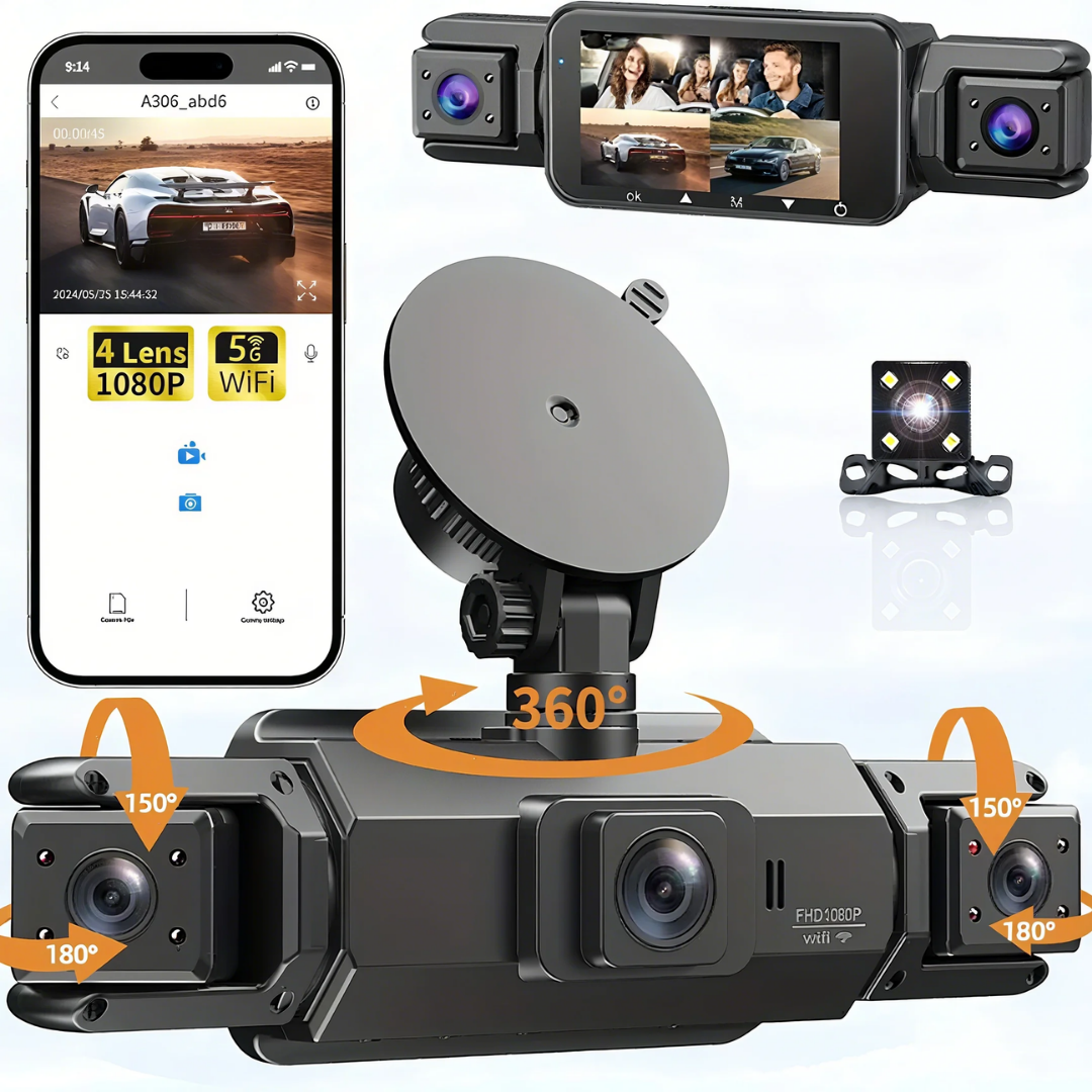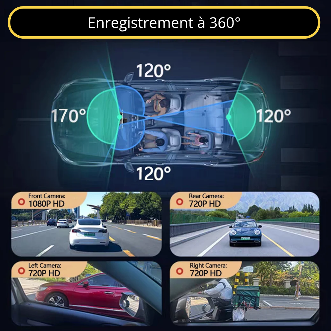 dashcam 360, dashcam 4 canaux, dashcam WiFi, caméra 360 voiture, caméra avant arrière latérale, dashcam vision nocturne, enregistreur 4 caméras, surveillance parking 24h, sécurité automobile.